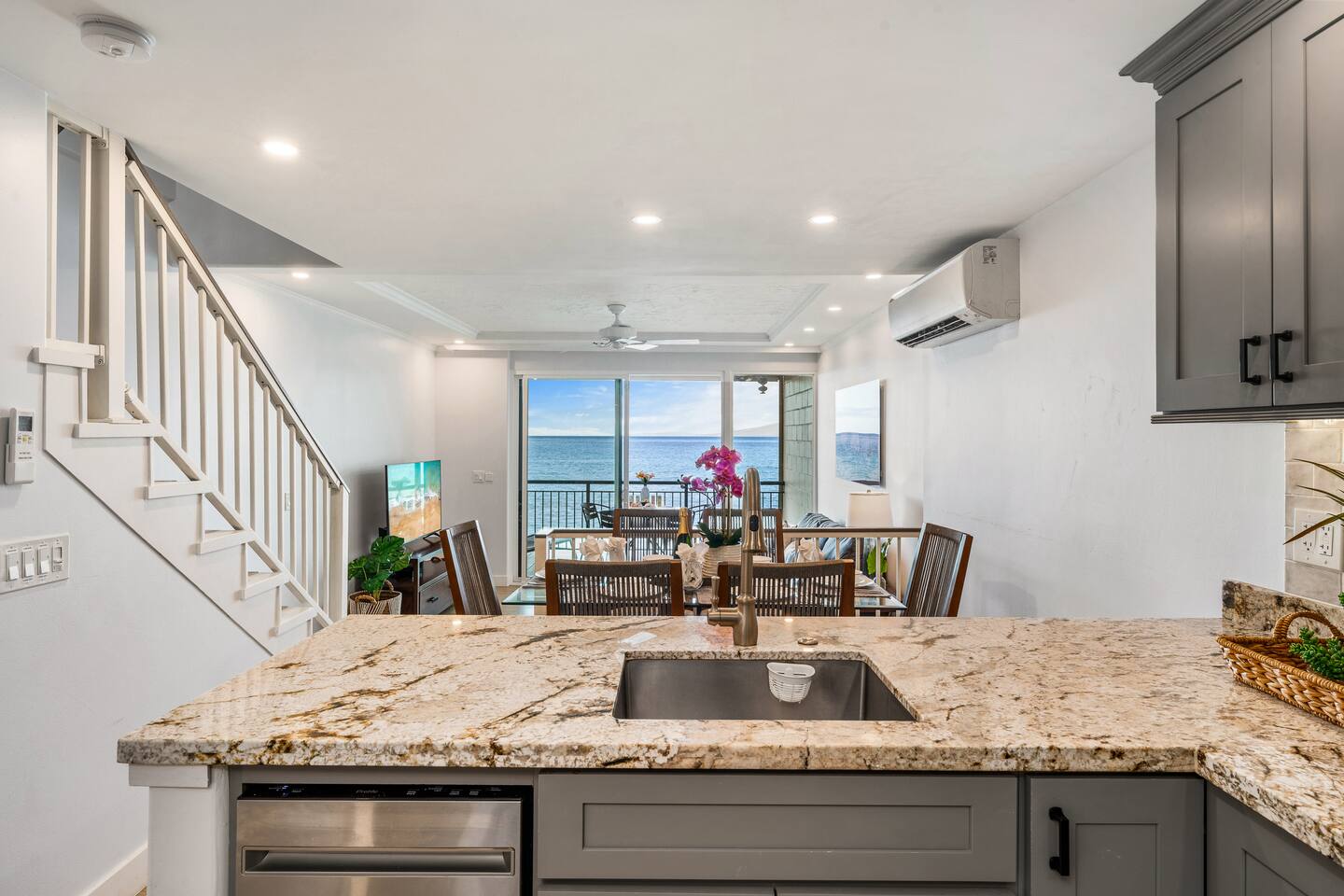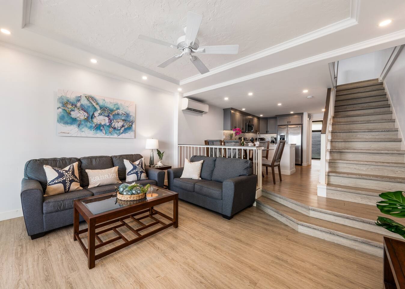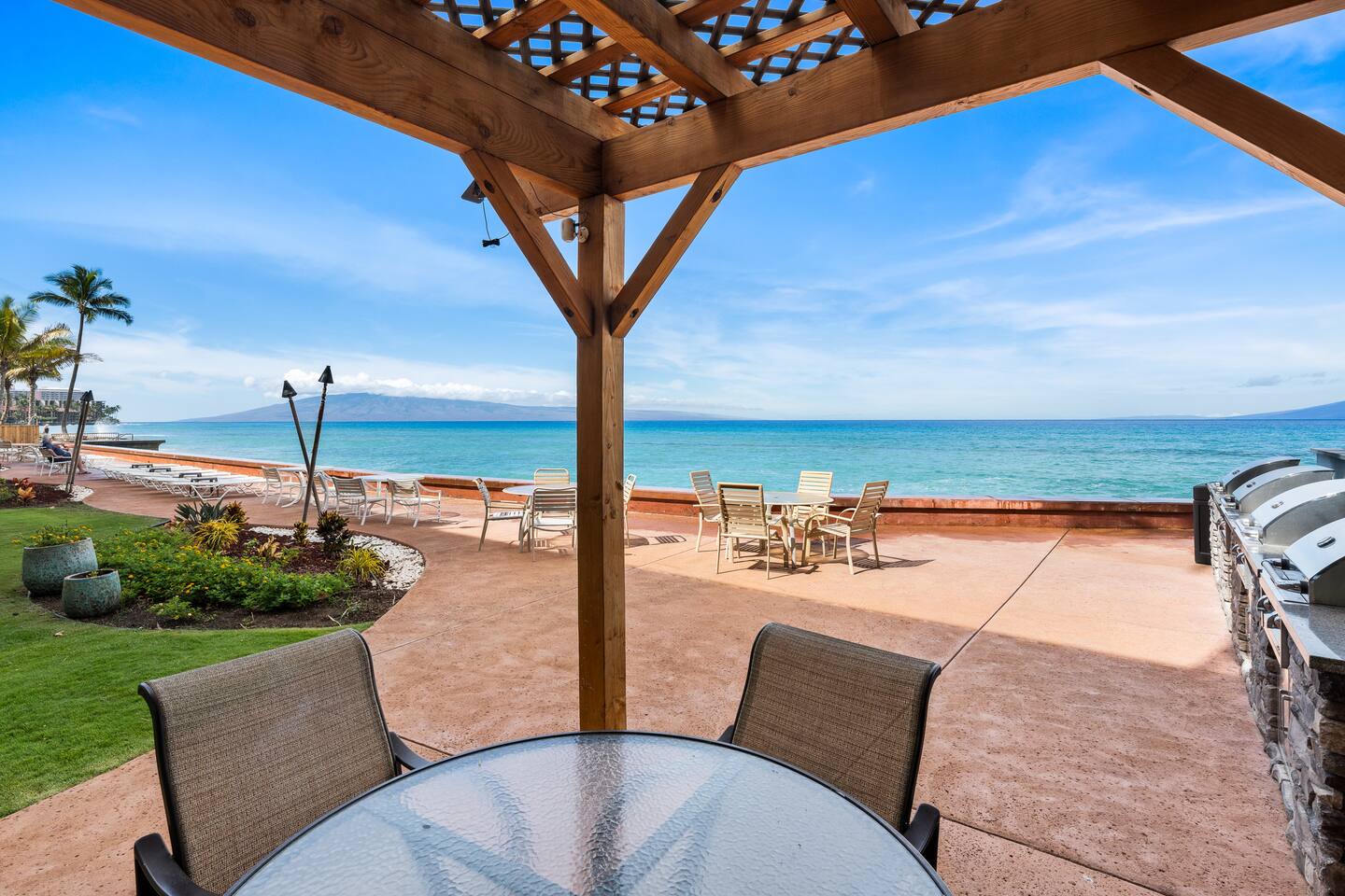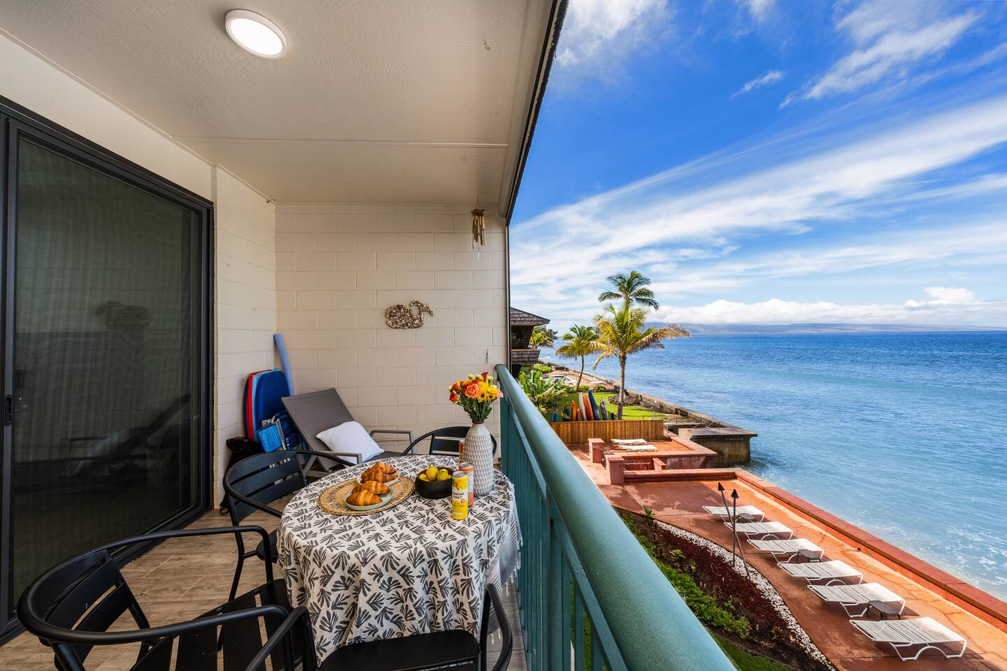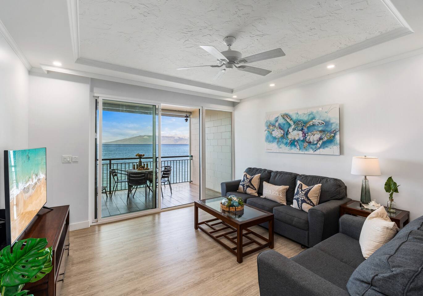 We welcome you to come visit us at Makani Sands 304! This condo has a special place in our heart, and we are pleased to share it with appreciative Guests! It has been designed for both comfort & convenience, featuring a fully-equipped kitchen with *everything* you could need, and a spacious living area that makes it feel like home away from home. We've installed split air conditioning & overhead fans in all rooms, and enjoy the added convenience of in-unit laundry. We’ve also provide baby essentials and beach gear to make your stay as hassle-free as possible! KEY FEATURES: 📍 Unbeatable Location! Oceanfront! Wake up to the sound of the waves and views of Molokai island right from your private lanais. Enjoy direct access to our seasonal beach. 🏡 Spacious Living: This 1,600 square foot home is perfect for families traveling together! The open-concept living area features large windows that fill the space with natural light. A well-appointed kitchen has everything you need to prepare delicious meals, whether you’re dining indoors or al fresco. 🛌 Sleeping spaces: Bedroom 1: California King bed with en-suite bathroom (upstairs) Bedroom 2: Queen bed with en-suite bathroom (upstairs) Bedroom 3: Two Twin beds Living Area: Queen sleeper sofa 🛜 Modern Amenities: Enjoy a contactless check-in with our SmartLock entry. You’ll receive a unique code a few days before your arrival for easy access to your unit. Stay connected with high-speed WiFi available throughout the condo, and indulge in entertainment with Smart TVs in the living area and all bedrooms. For added convenience, you’ll find an in-unit washer and dryer, as well as split AC units in all bedrooms and the main living area to keep you cool and comfortable during your stay. 🍴Fully Equipped Kitchen: Newly updated with modern appliances, this kitchen has all the essentials for daily living and hosting, including grill tools, coffee maker, blender, bakeware, and place settings for 8. 🏖️Beach Ready: You are welcome to use our beach towels, boogie boards, beach chairs, wagon, and a cooler for your seaside adventures. 💟Family-Friendly: We know its not easy traveling with kids, and have made baby essentials available for you, including portable crib, high chair, kids cups/plates/utensils. ✅ Included: Linens, bath towels, beach towels, start-up kitchen items, laundry detergent, and start-up shampoo/soap are provided. 🌴 Resort-Like Amenities: Take advantage of the community heated pool and barbecue area. Stroll through lush tropical gardens or take a short drive to local attractions, world-class Kaanapali beach, dining, golf and shopping. 🌅 Adventure Awaits: From snorkeling and surfing to hiking and exploring charming local towns, Maui has it all. Our condo serves as the perfect home-base for your island adventures! 5-7 min walk to nearest coffee shop, ABC store, gas, restaurants, massage, & souvenir shop. Check-out our other beautiful island properties at Tuvee Homes for your next vacation! KIND WORDS FROM OUR PAST GUESTS ⭐️⭐️⭐️⭐️⭐️ We absolutely enjoyed this updated, well-maintained condo right on the water. There was plenty of space for the two of us and our four teenagers. From watching the sea turtles swim by, to having a spot for the kids to jump in the ocean and do some snorkeling or to relax in the pool was amazing. This resort was clean and everyone was super friendly. Very convenient location, we will definitely be back! Family of 8 (six adults and 2 children) spent 10 nights at this condo in May. Great location. Walking distance to Kaanapali beaches and short drive to Napili and Kapalua. Nicely renovated and good amenities. Access to the ocean in the back and nice pool in the front of the building. Great bbq facilities and sitting areas ocean side. Highly recommended. We absolutely Loved our stay at Makani Sands unit 304. The view was incredible and often brought tears to my eyes. We watched the whales and sea turtles right from the lanai. What a bonus to have 2 lanais, one off the family room and the other off the largest bedroom upstairs. The kitchen had everything we needed and more. There was plenty of space for our family of 5 and we never felt on top of each other. They would light tiki torches each night along the oceanfront which we enjoyed and gave an awesome atmosphere after sunset. We plan to be back and would definitely book here again !